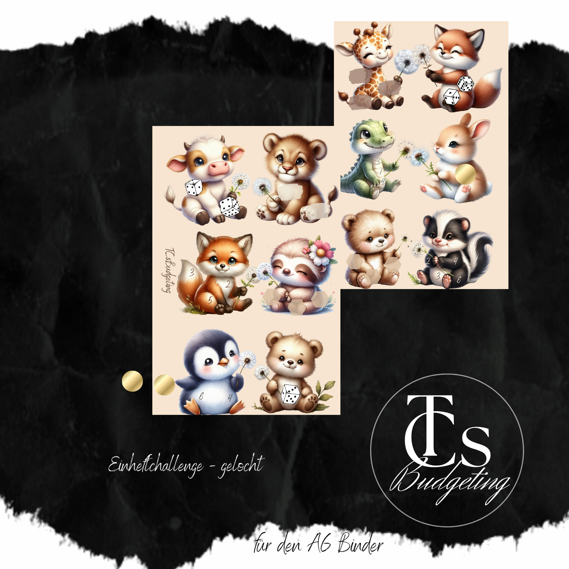 Hier bekommst du eine gelochte Einheft-Challenge für den A6 Binder. Die Challenge ist doppelseitig bedruckt. Die Werte (Lose ausgenommen) gehen bis 6 €.